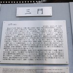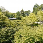 通天橋(コンクリートの橋脚)からみた新緑。 三門は登れず。