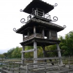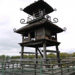 幹線道路に面しているのですが、風景が変わらないので知らずに通り過ぎてしまいます。遺跡から見つかった土器のかけらに書かれた線刻の建物の絵を、想像して復元した楼閣は、遺跡の中にある池の端にコンクリートの土台のうえに組まれていました。世に知られた有名な弥生遺跡ですが池と野原と農地が見えるだけで遺跡はわかりません。吉野ヶ里遺跡を想像して訪問するとがっかりします。コスモスが咲いておりました。